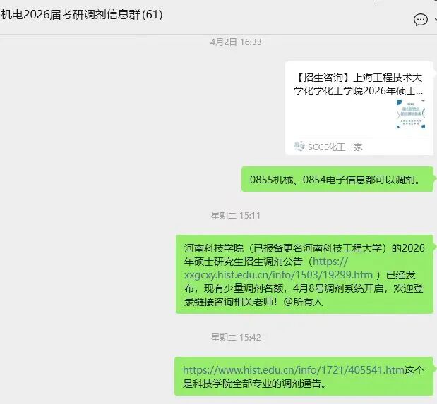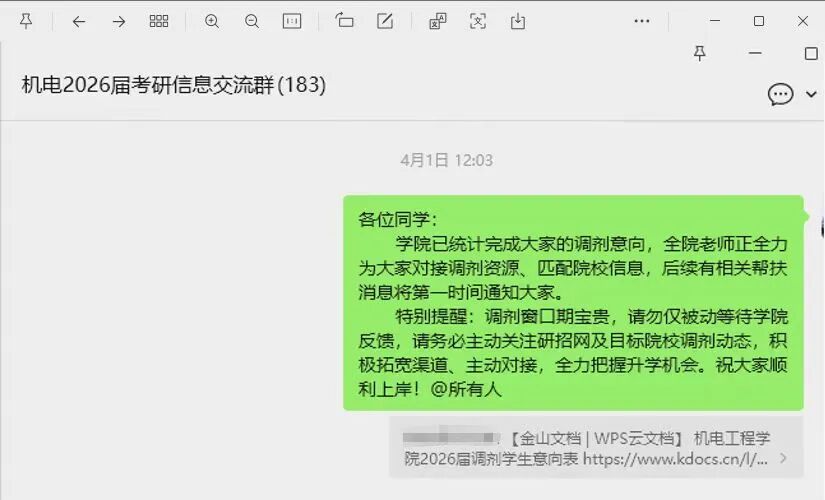 为精准对接学子差异化需求,学院第一时间完成2026届考研学子初试成绩、复试规划、调剂意向的全覆盖统计摸排,建立详实完善的学子信息台账。在此基础上,学院迅速搭建线上信息服务矩阵,专门建立考研信息交流群、调剂信息分享群,第一时间推送各大院校复试细则、调剂缺口、政策变动、等一手资讯,确保学子及时掌握关键信息,彻底打通信息壁垒